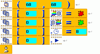| Vytvoří novou animaci, které nastaví jako první předmět číslo 9001 a jako poslední předmět 9004. Poté nastaví začátek animace na souřadnice 0 (x), 0 (y) a konec animce na souřadnice 100 (x), 0 (y). Potom nastaví čas animace na dvě sekundy a animaci pustí. Po skončení animace bude čekat na stisk nějaké klávesy nebo tlačítka myši. Všimněte si, že po svém vytvoření je animace upravována přes tabulku animací (je vytvořena jako první, tak má index 0). | | |