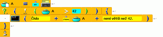 | Čeká, až uživatel zadá číslo. Podmínka v příkladu bude splněna a text vypsán, jestliže zadané číslo nebude větší než 42. | | |