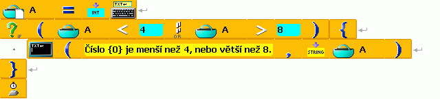 | Příklad (For modes 2D, 3D, Console) |    | | Čeká, až uživatel zadá číslo, a poté, pokud je zadané číslo větší než 4 a současně menší než 8, vypíše na obrazovku text. | | |