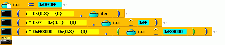 | Uloží do proměnné i číslo 1044735 v hexadecimálním tvaru. Poté ho vypíše spolu s čísly vzniklými operací XOR s hexadecimálními čísly FF a F88000. | | |