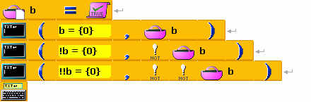|  | | Logická negace (NOT) (For modes 2D, 3D, Console) |  Zobrazit příkladySkrýt příklady | | Funguje jako logické unární mínus. Pravdivý operand změní na nepravdivý a naopak. |