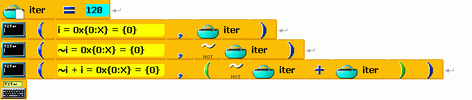 |  | | Bitová negace (NOT) (For modes 2D, 3D, Console) |  Zobrazit příkladSkrýt příklad | | Je definována pro celočíselné datové typy. Způsobí, že všechny jednotkové bity čísla se stanou nulovými a naopak. | | Do proměnné i uloží čísl 128, poté ho vypíše spolu číslem vzniklým negací všech bitů čísla i a číslem, které je součtem čísla vzniklého negacím všech bitů čísla i a čísla i. | | |