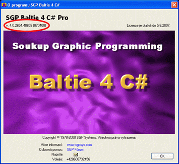 SGP Baltie 4 C#. Číslo verze je na obrázku červeně zakroužkováno. Vpravo od něho je datum vypršení Vaší licence a úplně dole webové stránky SGP Systems, odkaz na SGP Fórum a kontakt na firmu SGP Systems.