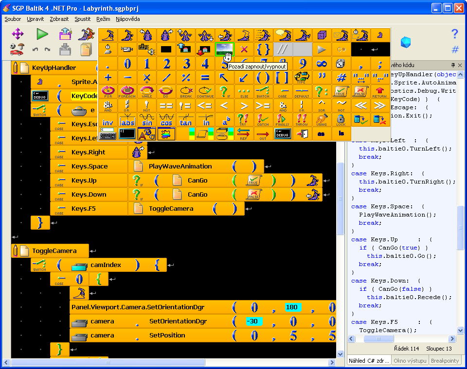 • Stejně jako v přímém režimu je možno průběžně sledovat zápis v C# zobrazení.