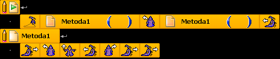a v něm klepnete na ikonku s listem papíru vlevo od názvu metody, kterou chcete zavolat. Okno se pak zavře a vy umístíte příkaz k volání metody do požadované pozice. Kdykoliv pak program na tento příkaz narazí, provede posloupnost příkazů definovaných v těle dané metody.