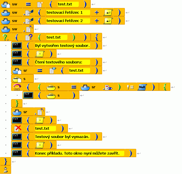 |  | | Piš (For modes 2D, 3D, Console) |  Zobrazit příkladSkrýt příklad | | Zapíše daná data do souboru. | | Vytvoří soubor Test.txt ve složce, ve které je vytvořený program, napíše do něj text (testovací řetězec 1..). Soubor zavře.Poté zjistí, jestli existuje a pokud ano, tak oznámí, že byl vytvořen textový soubor, vypíše po řádcích jeho obsah a opět soubor zavře. Nakonec soubor zase smaže a oznámí, že byl smazán. | | |